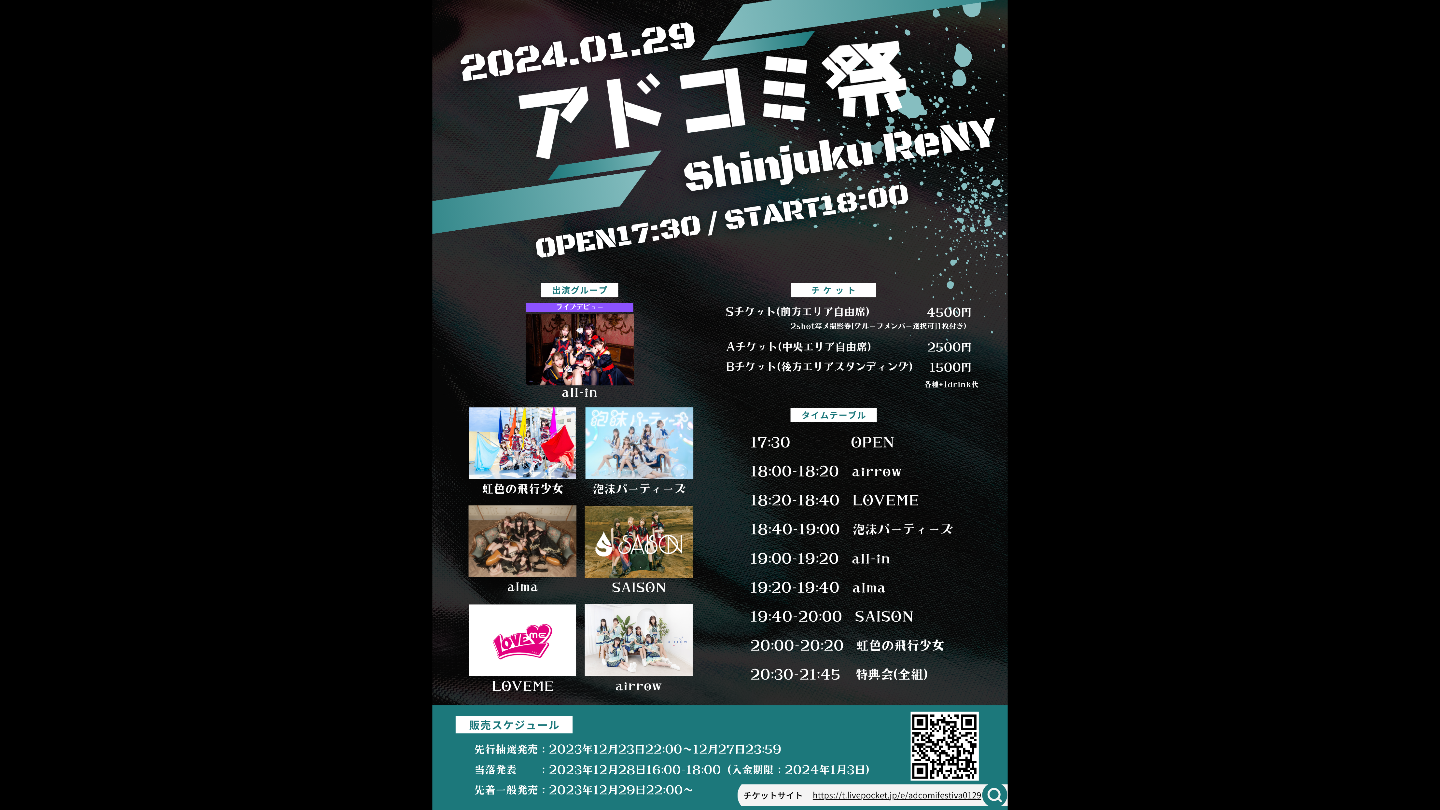 アドコミ祭にてLIVEデビュー開催決定 新宿ReNY 2024年1月29日(月) アドコミ祭にてall-inのLIVEデビューが決定。所属事務所のグループが総勢7組出演いたします。 HPを更新しました お知らせ 2023年12月22日(金) all-in 公式ホームページを更新しました